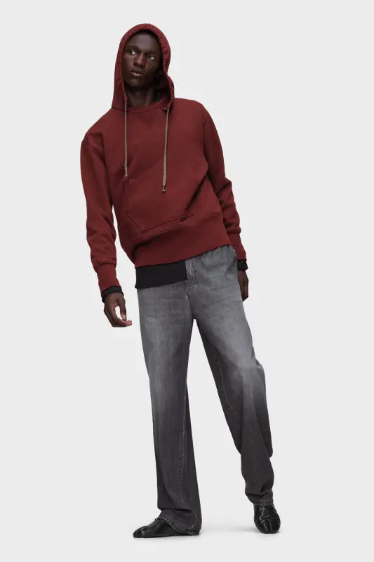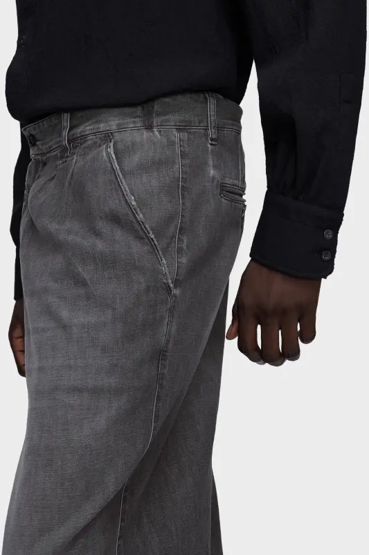 These straight-leg jeans are treated with the Maison’s sun faded technique, shifting grey tones from dark to light for a lived-in effect. Pleats sharpen the front, lending structure against the softened denim. An everyday form is elevated through treatment and proportion. At the back, the Maison’s signature four stitches appear; the opposite of a label.